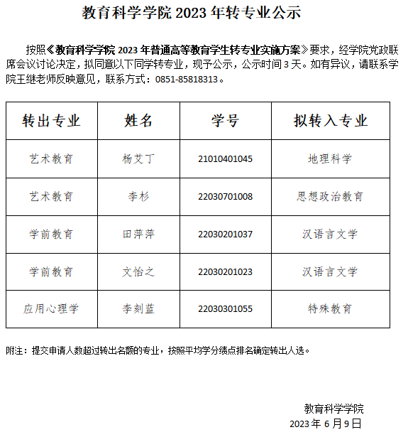 教育科学学院2023年转专业公示(转出)