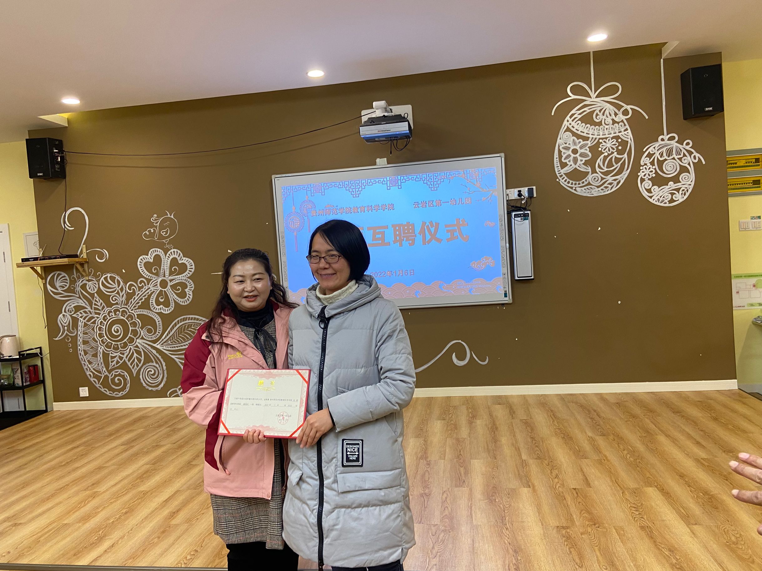 云岩区第一幼儿园副园长何莹燕为学前教育系老师们颁发聘任证书,聘任刘英为幼儿园教科研副园长,聘任王小为、陈泽婧、何玉红、李姿雨为校外指导教师;黎平辉为何莹燕颁发聘任证书,聘任其为学前教育系副系主任;娄小韵为云岩一幼4名教师颁发聘任证书,聘任其为学前教育系校外指导教师。