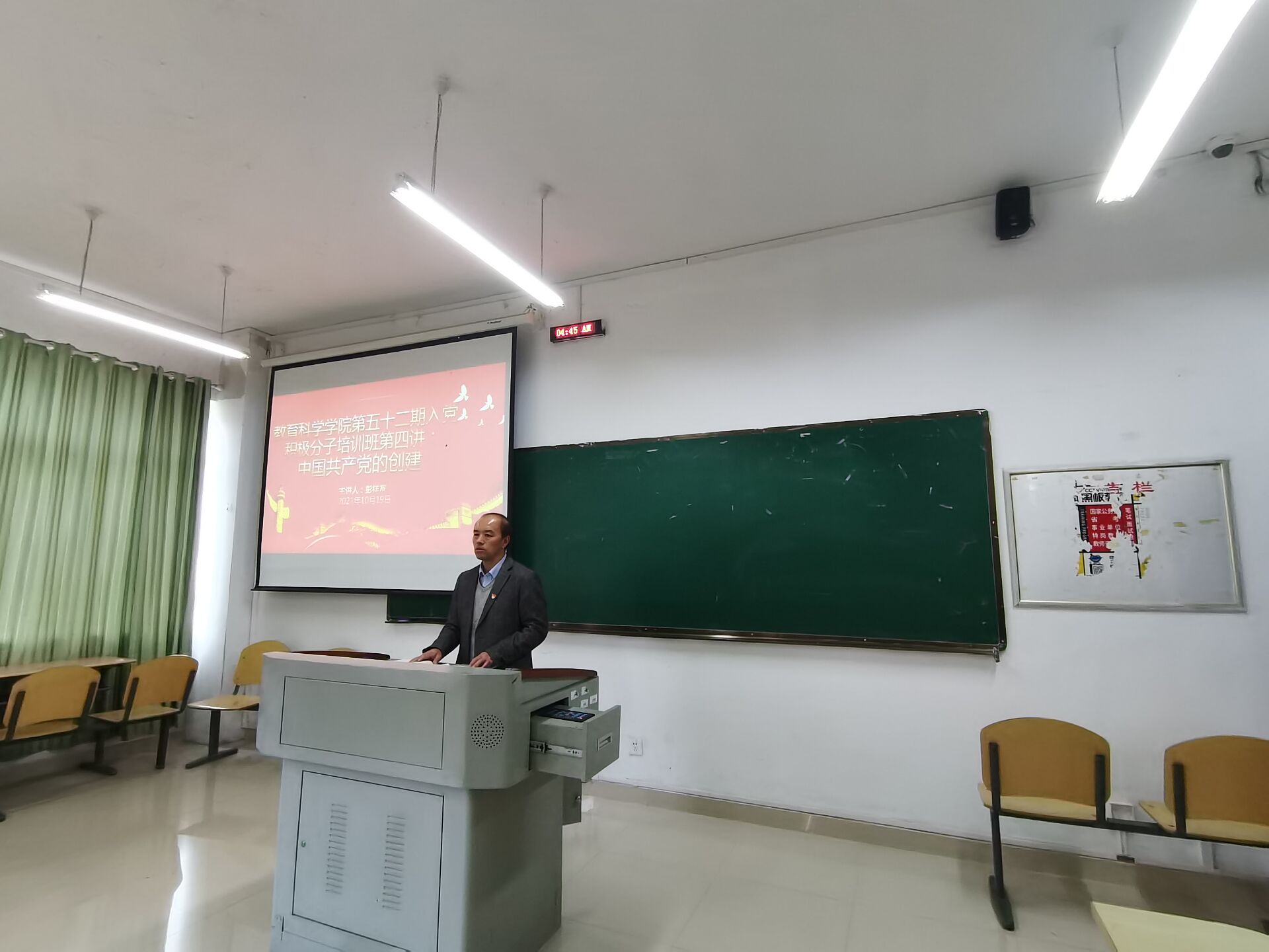 1019日中午教育科学学院第52期入党积极分子培训班于逸夫楼515教室开展了入党积极分子培训教学第四课——关于中国共产党的创建学习这次培训由学院党委书记彭祥友授课