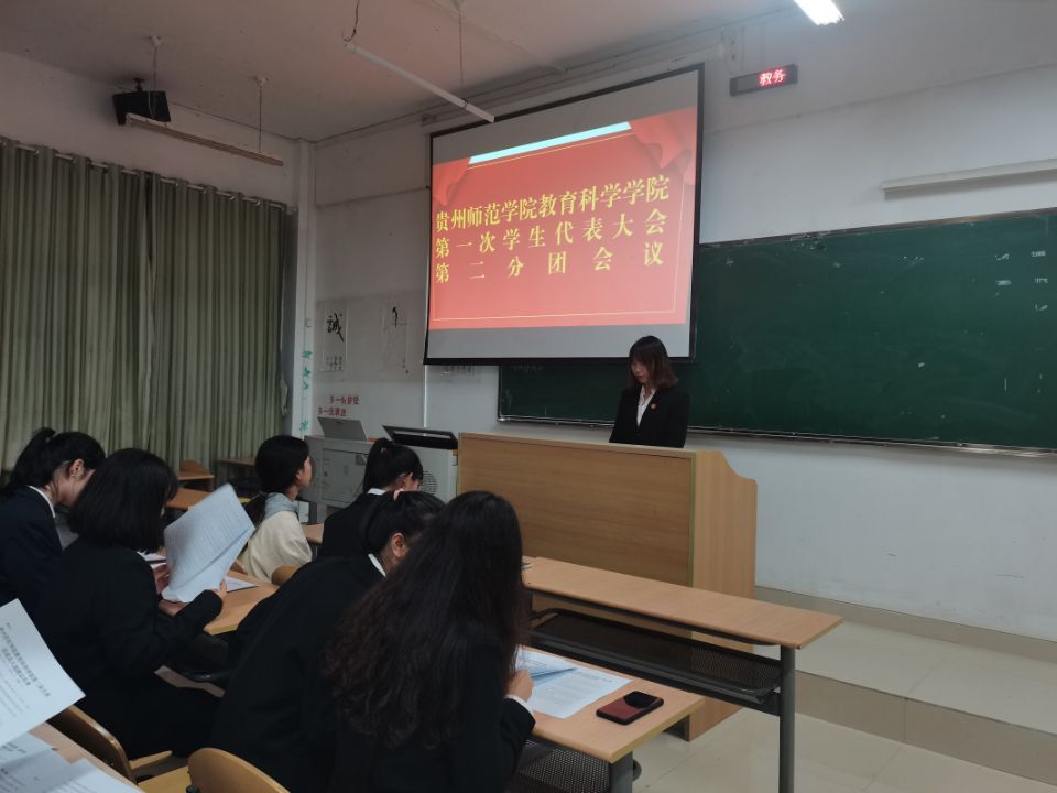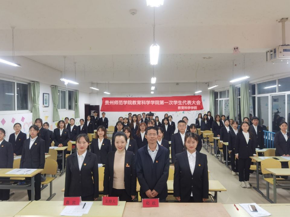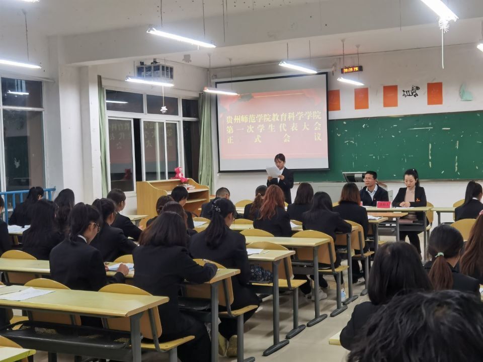10月19日教育科学学院在逸夫楼516、514、304召开了贵州师范学院教育科学学院第一次学生代表大会。我院党委组织员赵政、团委书记张源,第12届学生会主席、校级学生会代表以及各班的51名学生代表参会。