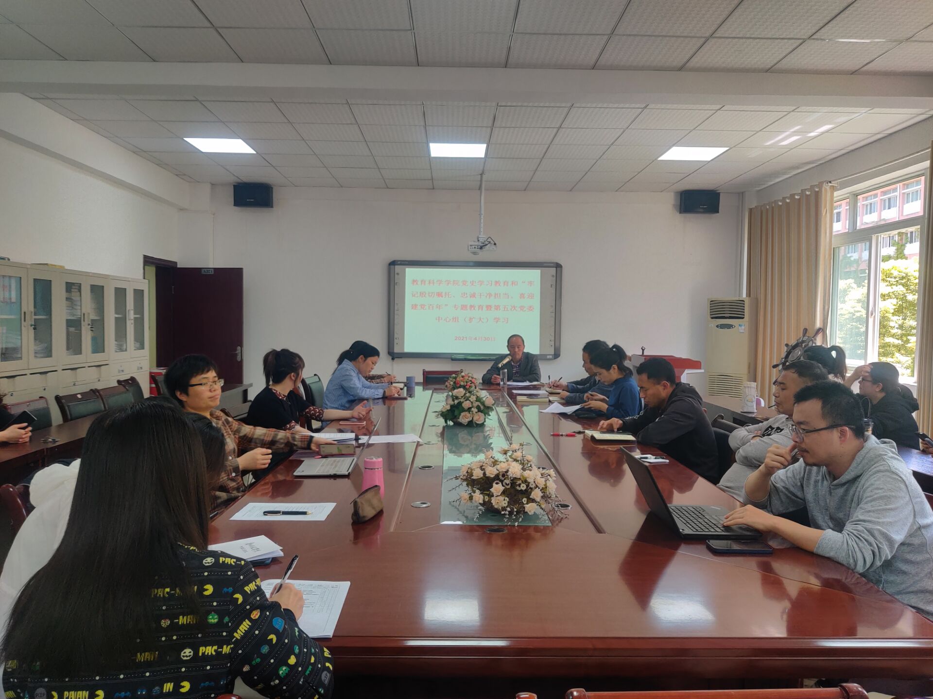 2021年4月30日中午1:00,教育科学学院在逸夫楼会议室举行党史学习教育和“牢记殷切嘱托、忠诚干净担当、喜迎建党百年”专题教育暨第五次党委中心组(扩大)学习,学院党委书记彭祥友主持,学院党委中心组成员参加,全体教师党员列席学习。