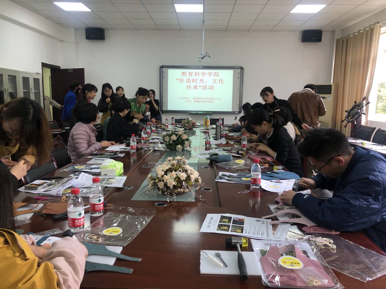 为丰富教职工生活,缓解平时工作压力,培养积极参与的热情和团队协作意识,教育科学学院于2020年10月30日下午在教育科学学院会议室举行了教职工皮具制作活动,教育科学学院全体在职员工参与了本次活动。