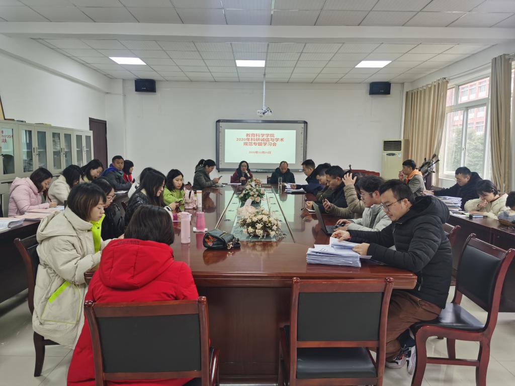 为进一步加强科研伦理和学风建设,维护学术诚信,有效预防学术不端行为,教育科学学院组织全院教职工开展科研诚信与学术规范系列文件的学习活动。2020年12月25日下午,在学院教育科学学院会议室,副院长袁川带领全体教师认真学习了《关于进一步加强科研诚信建设的若干意见科研诚信与学术规范管理文件》、《哲学社会科学科研诚信建设实施办法》等八个文件。