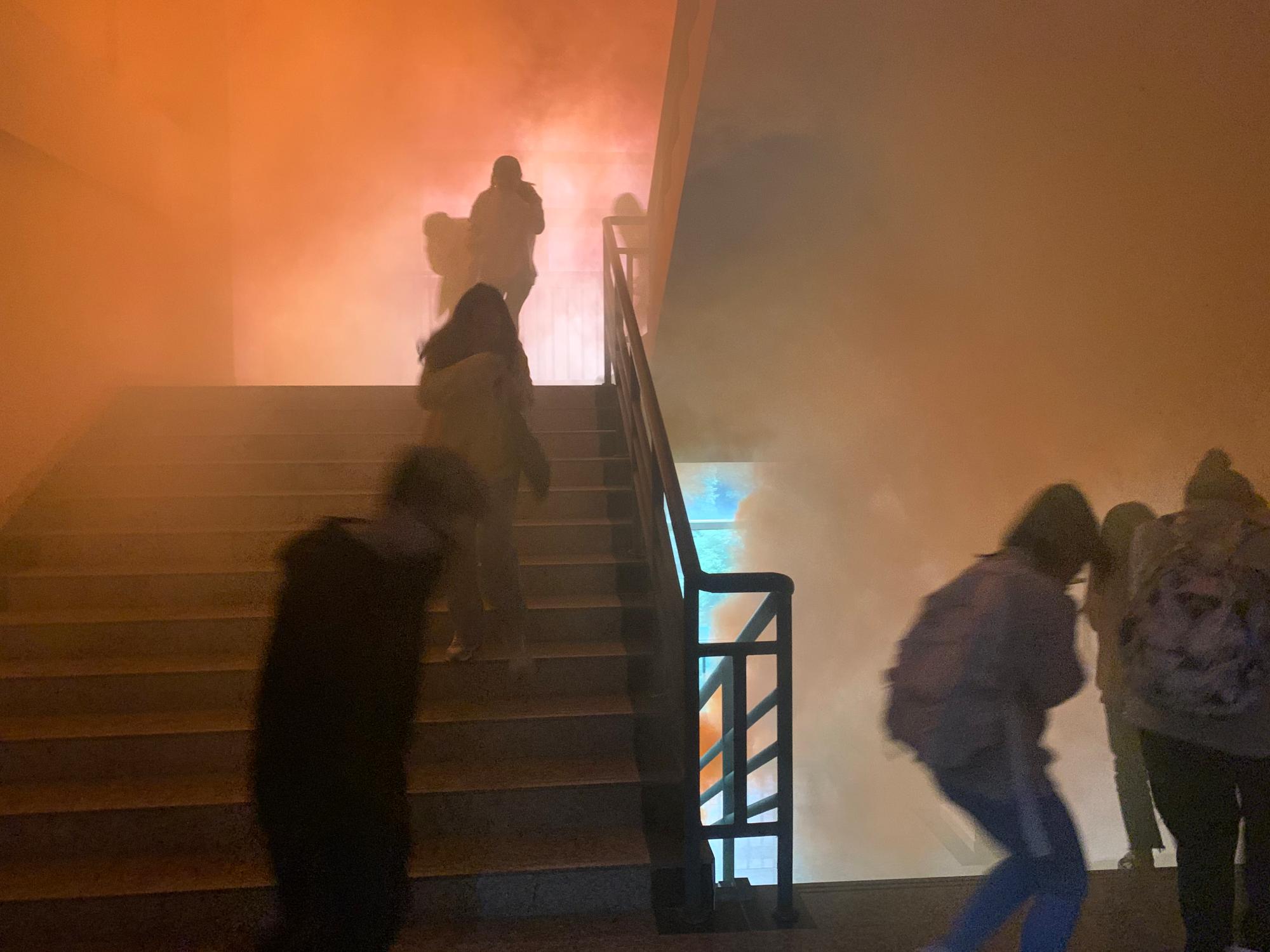 培训结束后,学生进入6楼实验室,进行逃生演练。模拟演练现场,烟雾弥漫,老师们组织学生捂住口鼻,有序从安全通道撤离实验室到达安全位置。演练结束后,同学们回到会议室,表达了参加这次演练的感受,纷纷表示这样的演练非常有必要。