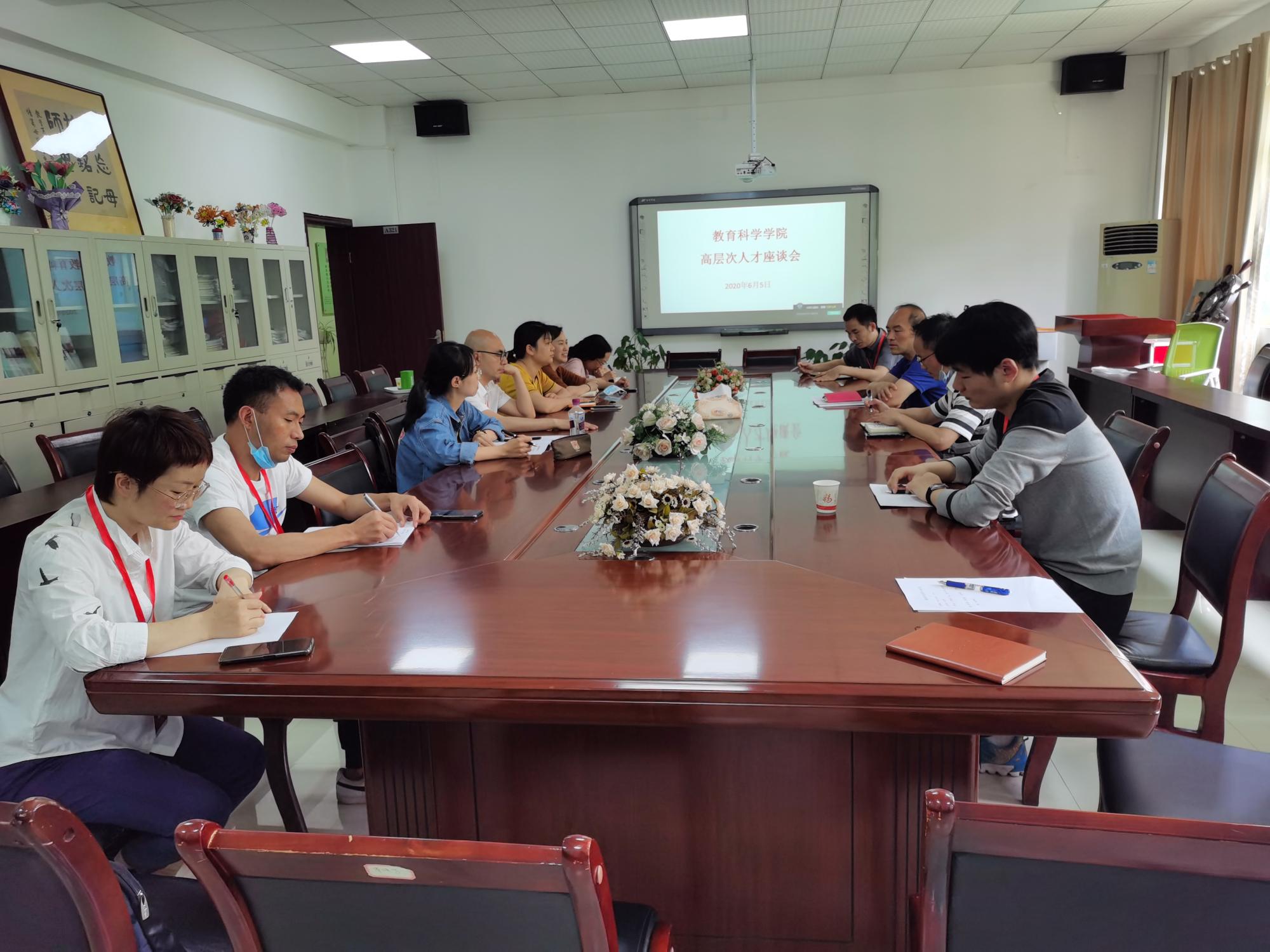 2020年6月5日中午13点,教育科学学院召开高层次人才座谈会。院党委书记彭祥友、院长刘红、党委副书记傅小芳、副院长黎平辉、副院长袁川、所有博士、教授参与了本次座谈会。本次座谈会由党委书记彭祥友主持。