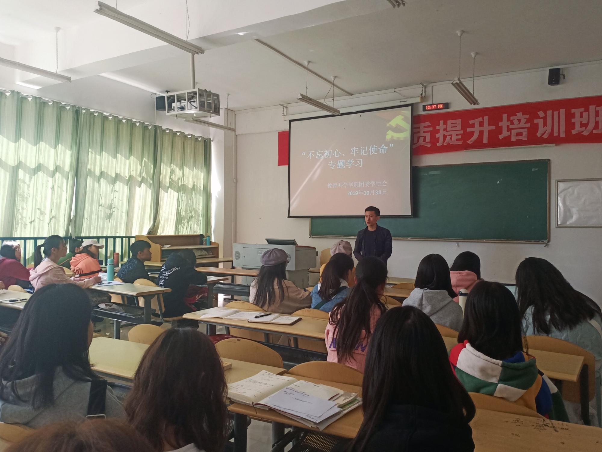 2019年10月31日中午12:20分,教育科学学院团委学生会全体同学在逸夫楼503举行了“不忘初心、牢记使命”的主题教育,教育科学学院团委书记张源主持本次学习活动。