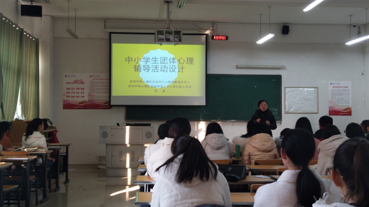 2019年12月11日上午,贵阳市观山湖区袁老师青少年心理护航工作站副站长孙蓓老师应邀到我院,开展“中小学生团体心理辅导活动设计”讲座活动,讲座在逸夫楼503教室进行,应用心理学系罗凯老师及2017级应用心理学专业全体学生参加了本次讲座活动。