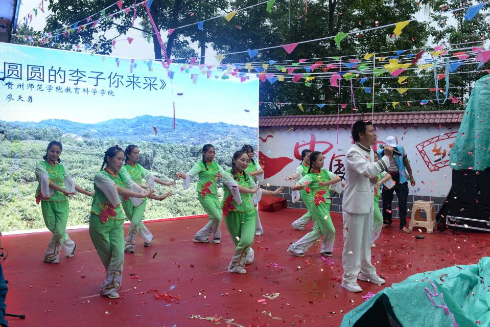 大合唱《我的家乡好地方》拉下了文艺汇演的帷幕,“我的家长好地方,腊脚大坡情飞扬,我的家乡好地方,山珍腊味任品尝,热汗浇灌花万朵,千亩果园谱篇章。”腊脚村的廖天勇老师的一曲《果香的地方》,唱出了腊脚村庄的魅力,我校伴舞的同学们,在雨中翩翩起舞,舞出那一段段腊脚风情,踩出那一步步腊脚发展的脚步;小朋友蹦蹦跳跳的欢乐舞蹈,让这个雨天多了一些欢笑,多了一份可爱,展现了这个时代的美好。我校带来的《我爱你,中国》手语表演,更是展现了这支社会实践服务团队的爱国情怀。汇演还有大众喜闻乐见的快板节目,全面介绍了腊脚村现在的发展状况,腊脚村主要以培育李子、猕猴桃等为主要经济来源,体现了腊脚村的发展离不开国家政策的支持,离不开村民的共同努力。