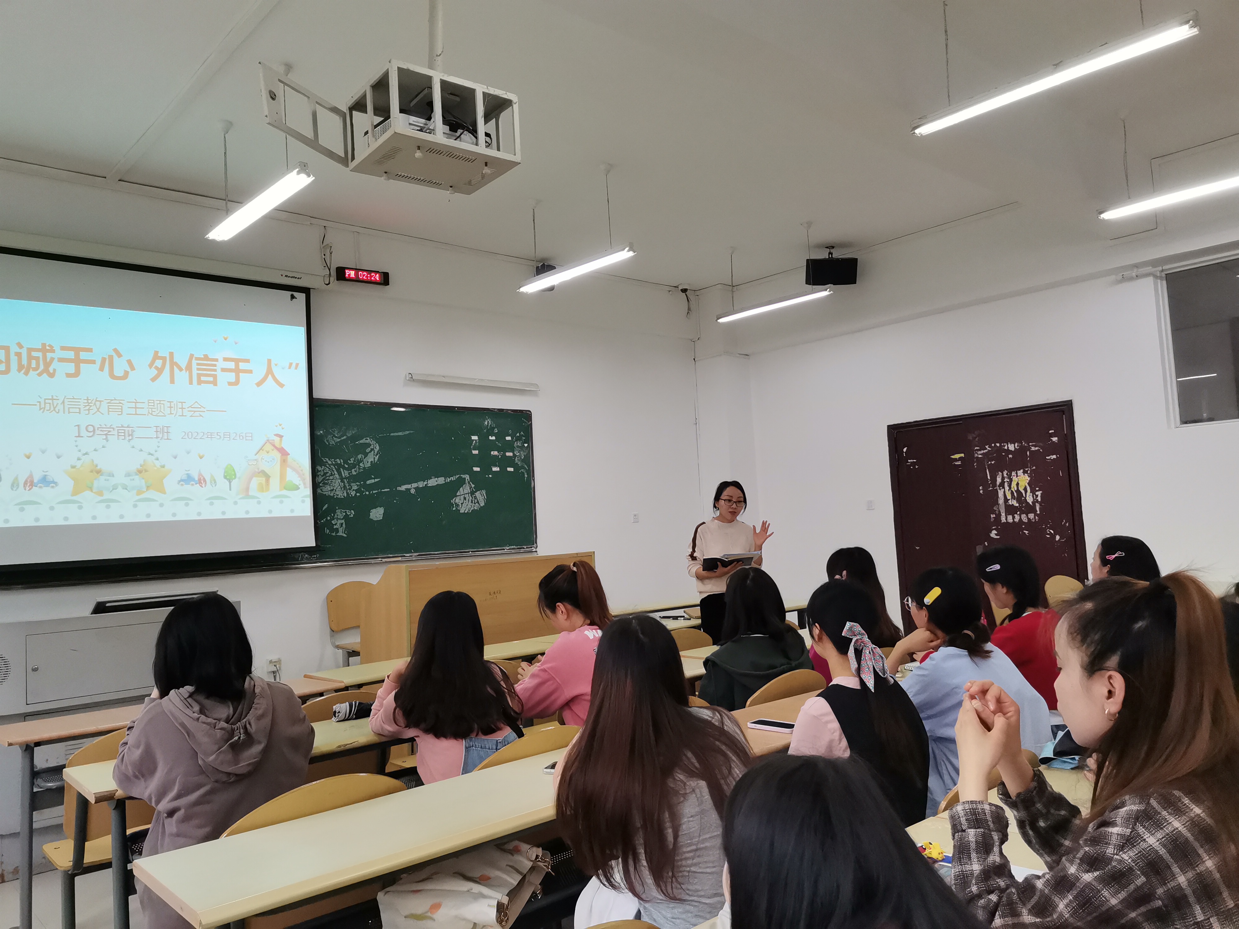 为深入贯彻习近平总书记关于教育重要论述和党的十九大、十九届历次全会精神,坚持把促进家庭经济困难学生成长作为资助工作的出发点,紧紧围绕立德树人根本任务,深入推进资助育人,增强当代大学生的诚信意识和责任担当,5月26日,教育科学学院2019级学前教育二班在逸夫楼303教室开展以“内诚于心,外信于人”诚信教育主题班会。会议由班长王利蓝主持,辅导员游超颖参加会议。