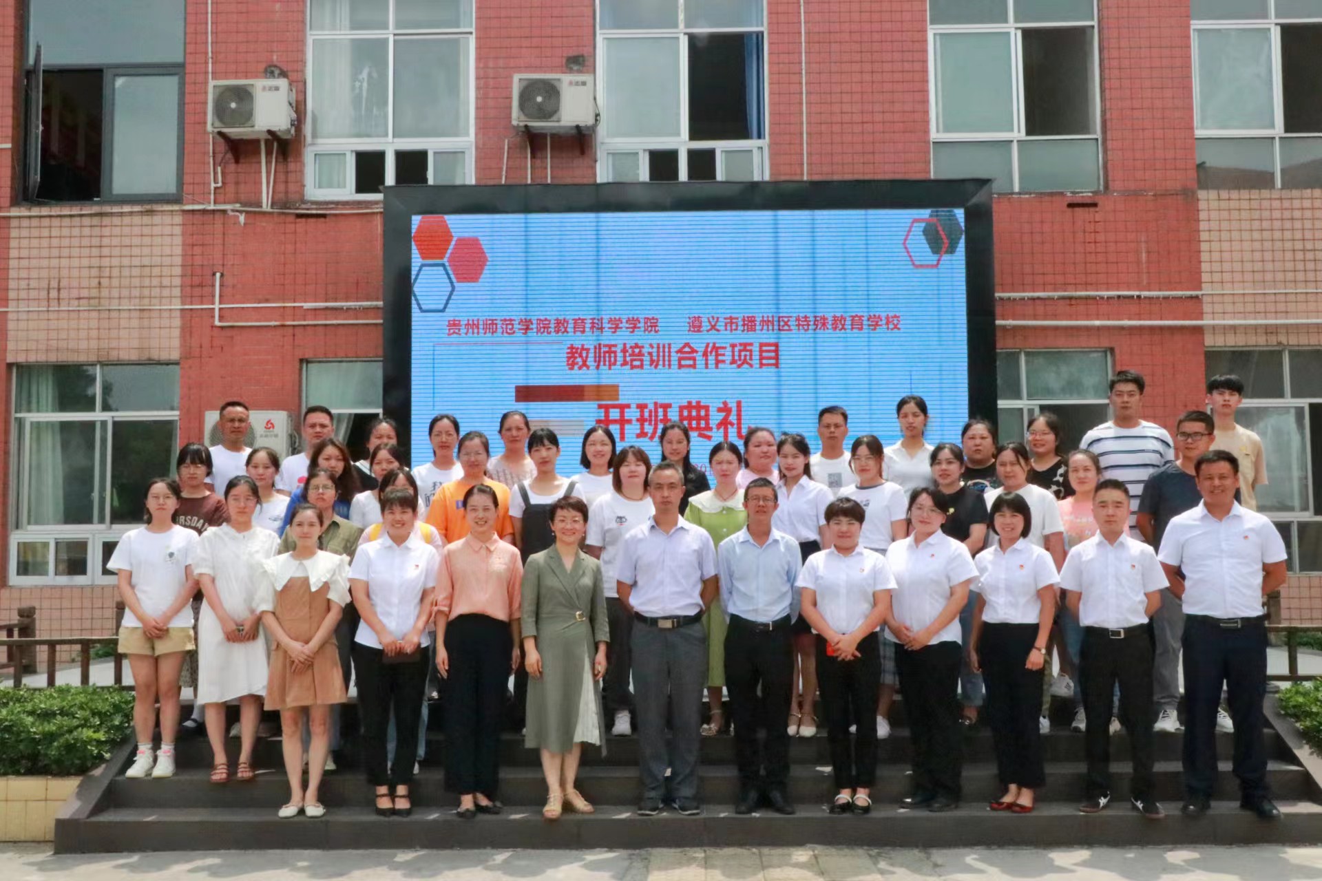 2022年8月30日下午,遵义市播州区特殊教育学校与贵州千亿qy88国际官网入口教师培训项目开班典礼在播州区特殊教育学校举行。参会的人员有贵州千亿qy88国际官网入口宋万琚院长、吴晓英博士、播州区人民政府教育督导室督学吴光宇、播州区特殊教育学校的全体教师以及片区的教师代表等,会议由播州区特殊教育学校校长杨启勇主持。