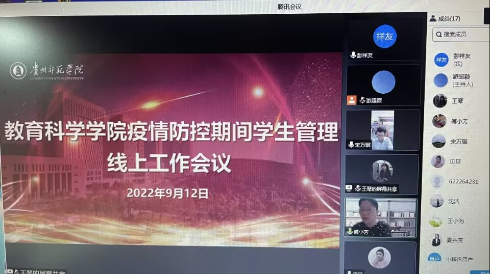 根据学校疫情防控期间学生管理工作调度会的指令,9月12日,教育科学学院在线上召开疫情防控期间学生管理工作会议。全院党政主要领导、学院团委书记张源、全体专兼职辅导员及科研助理参加了此次会议。会议由傅小芳主持。