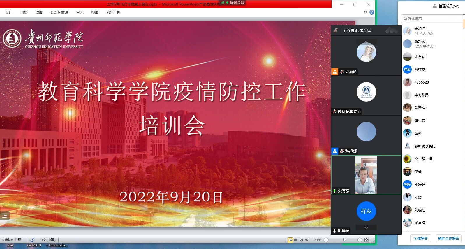 为进一步加强疫情防控工作,促进全体师生更好更全面掌握防控政策和措施要求,切实保障教育科学学院师生员工的身体健康与生命安全,根据学校疫情防控工作安排,2022年9月20日20:00教育科学学院召开线上疫情防控专题培训会议,会议由院长宋万琚主持,全体教职工参加会议。