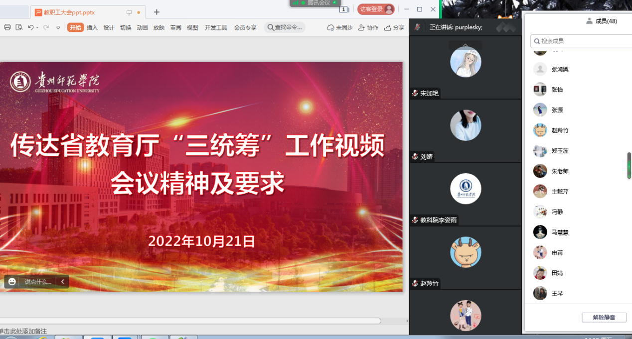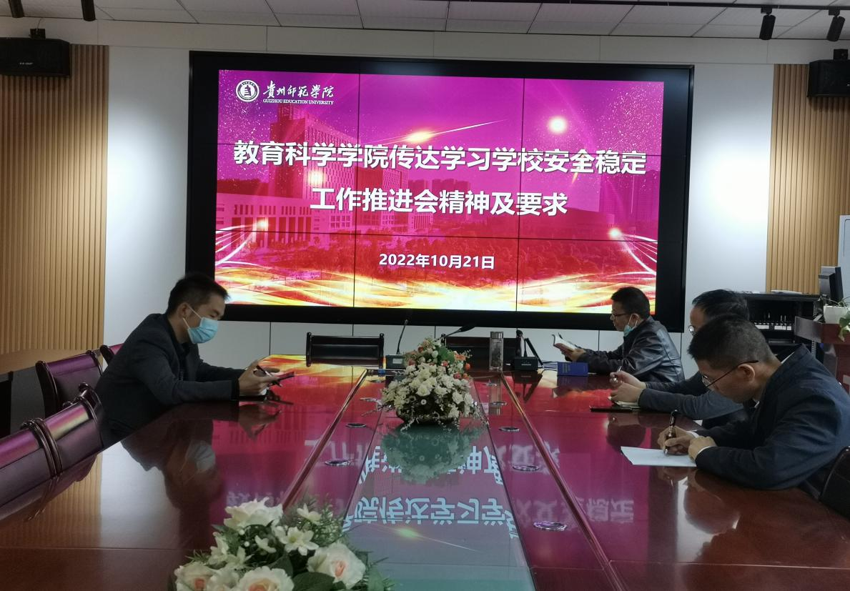 10月21日下午,教育科学学院采用线上线下相结合的方式召开会议,传达学习省教育厅“三统筹”工作和学校安全稳定工作会议精神,会议由院长宋万琚主持,全院教职工参加了会议。