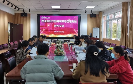 2022年11月29日,贵阳市教育局领导李艳一行到我校交流合作。我校教育科学学院院长宋万琚、院党委副书记傅小芳、副院长黎平辉、副院长袁川、吴晓英及特殊教育专业教师杨娟、雷经国、杨曼进行接待并出席本次研讨会,杨娟主持本次会议。