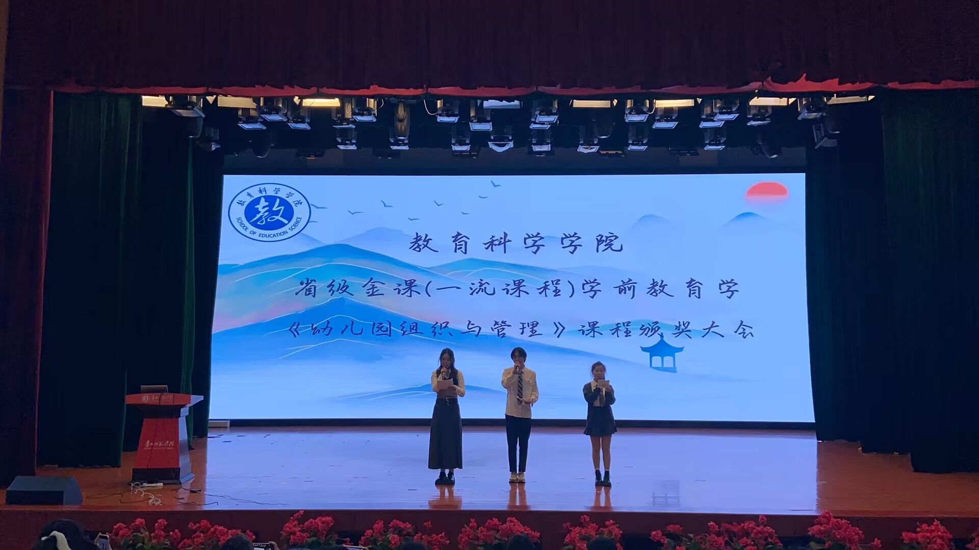 2023年3月24日,贵州千亿qy88国际官网入口贵州省“金课”(一流课程)《学前教育学》、《幼儿园组织与管理》课程学习展示暨颁奖典礼在逸夫楼演播厅举行。教育科学学院院长宋万琚教授、副院长黎平辉教授、袁川教授、学前教育系系主任娄小韵教授、团委书记张源老师、辅导员申苒老师等出席典礼。