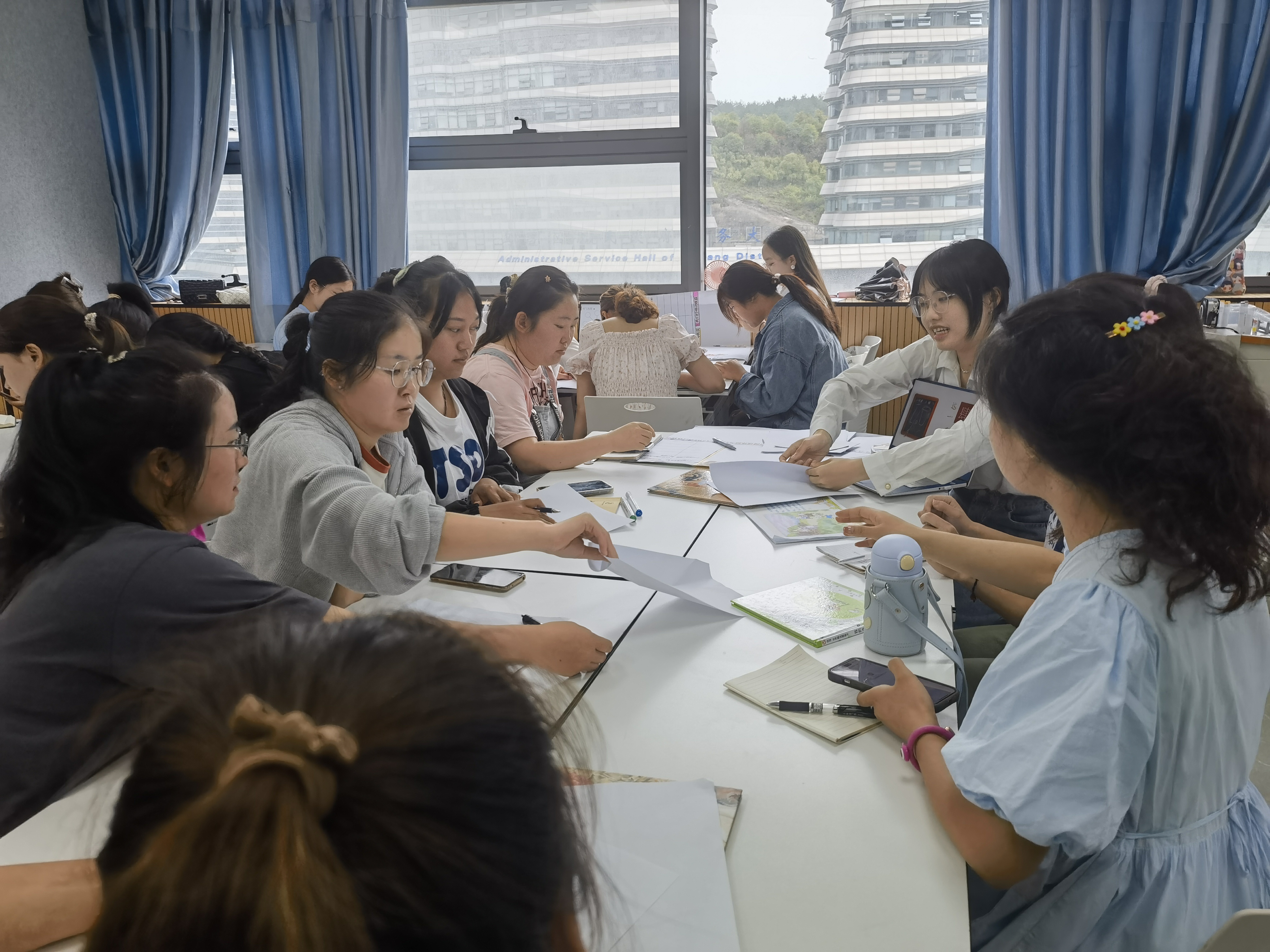首先由乌当区教育科研与教师培训中心专职教研员罗艺老师开场主持,罗艺老师介绍了本次培训的背景和目的,并对参加此次活动老师提出基本要求。接着,由我院20级学前教育专业杨冬、刘小芳同学作绘本推荐活动,她们从绘本的创作背景、推荐理由、教育意义、绘本活动对传统文化经典绘本“饺子和汤圆”展开了专业精彩的解读。在观看了该绘本讲读视频后,老师们结合罗婷老师梳理的分析绘本维度及具体思考的问题作出分享。根据老师们的现场反馈分享,罗婷老师分析了一线教师分析解读绘本的现状及问题,并针对老师们共性问题开展了“绘本图片赏析”的专题讲座。紧接着罗婷老师开展了“早期阅读核心经验”的专题讲座,从核心经验的三个维度结合丰富具体的案例进行了深入分析,并进一步总结与梳理了实践教学中如何应用早期阅读核心经验理论的基本原则。最后,在我院三位同学及乌当区高新幼儿园李婷、王森霖、陈晓琳三位老师的带领下,全体成员分成六个小组,以“三只小猪的真实故事”绘本为载体,开展了“5C”团体探究活动。通过分组的团体探究活动,老师们深入的解读了绘本的图文元素,并结合早期阅读核心经验理论进行了回顾与梳理。