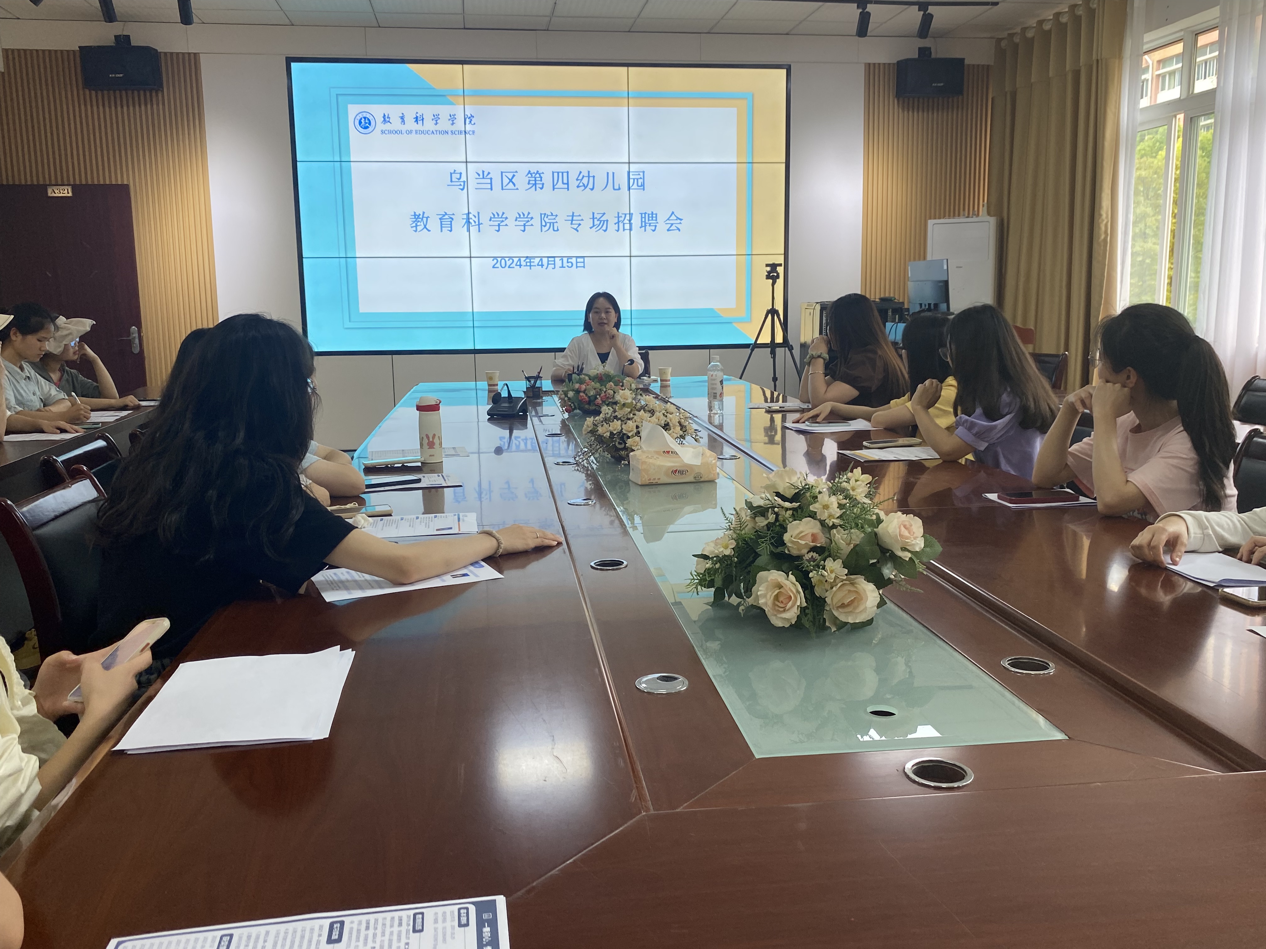 4月15日下午,教育科学学院在逸夫楼三楼会议室举办学前教育专场招聘会,云岩区第八幼儿园、南明区第七实验幼儿园、乌当区第四幼儿园等三家用人单位前来招聘。20级学前教育专业毕业生到场参加。