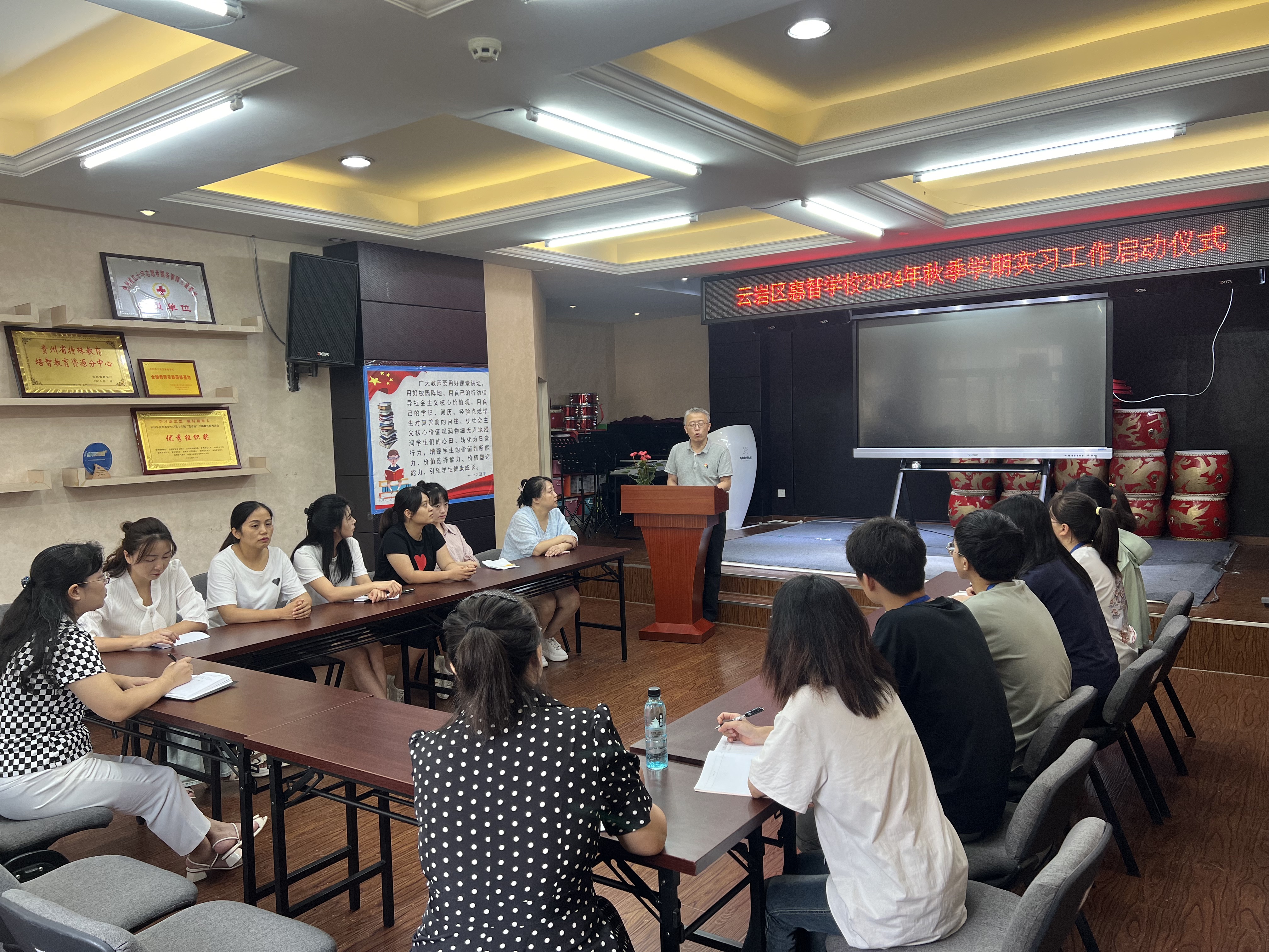 2024年9月2日,贵州千亿qy88国际官网入口夏卉芳教授带领6名2021级特殊教育专业实习生前往贵阳市云岩区惠智学校进行为期一个学期的实习。经过9天的适应性实习,2024年9月11日实习生正式进班实习,贵州千亿qy88国际官网入口与云岩区惠智学校联合召开2024年实习工作部署暨实习单位指导教师培训会,云岩区惠智学校梁波校长、黄礼琼副校长、赵校瑛主任和6名指导老师,以及贵州千亿qy88国际官网入口夏卉芳教授和6名2021级特殊教育实习生参加本次会议。本次活动由赵校瑛主任主持。
