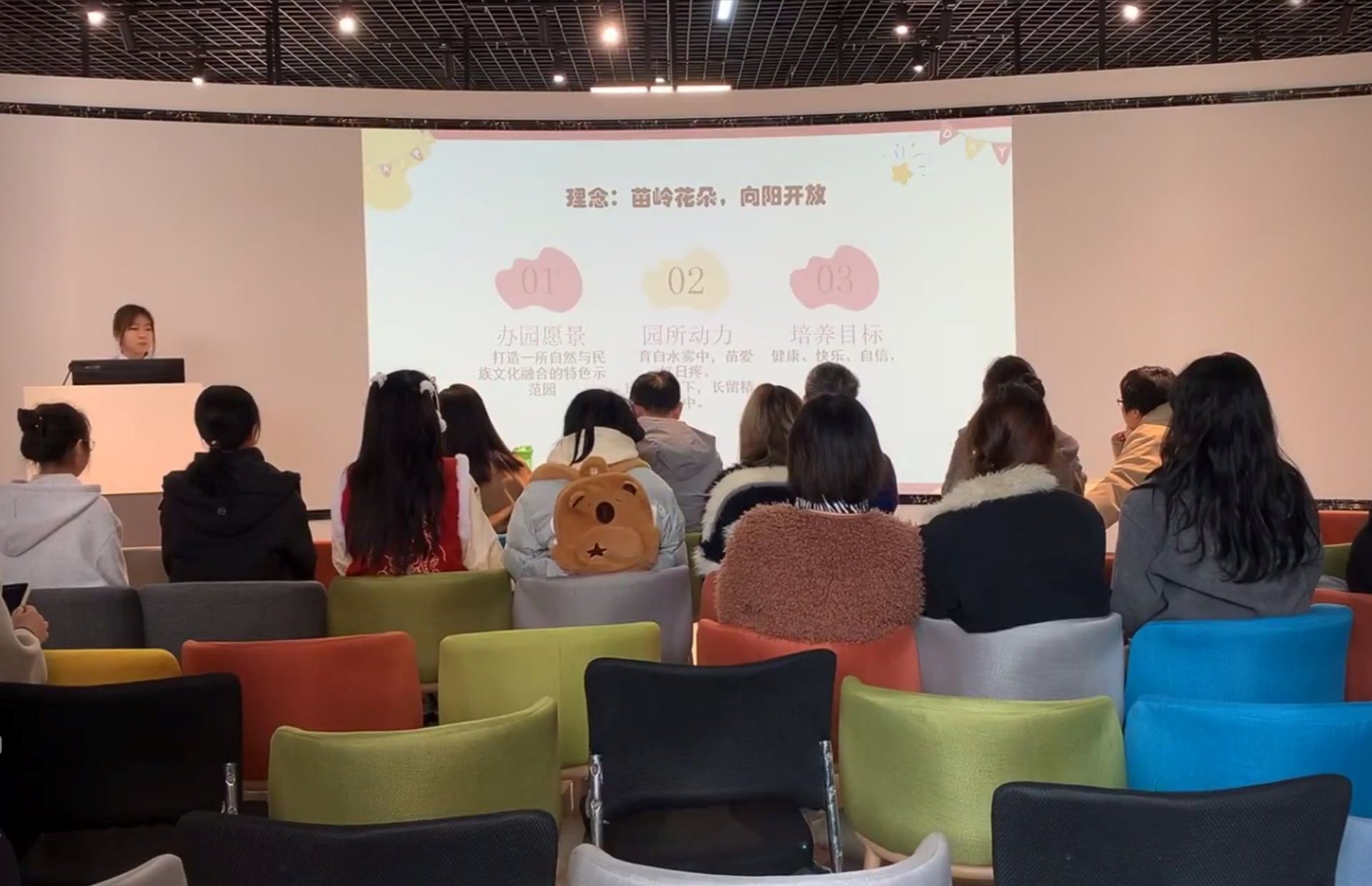 首先教育科学学院副院长黎平辉致辞,对此次活动及相关课程改革寄予厚望,为活动拉开了序幕。紧接着,课程实践导师之一云岩区第十二幼儿园骆志琴园长分为我们回顾这三年作为课程实践导师的一些工作及感受,从一线教育者的视角,为在场师生带来了极具价值的经验与思考。随后同学们对课程成果进行展示,同学们将理论知识与实践创意相结合,生动地呈现了幼儿园从环境布局到课程设计、从人员管理到活动组织的多方面构想与成果,充分展现出对《幼儿园组织与管理》课程的深刻理解与灵活运用。然后课程负责人郑玉莲博士进行《幼儿园组织与管理》课程改革实践反思分享,讲述课程教学改革的历程,介绍了课程在线上与线下融合、理论与实践融合、课内与课外融合的具体做法,通过建构强大的实践学习支持系统,为学前教育专业学生提供多元学习平台,打造多元学习机遇。