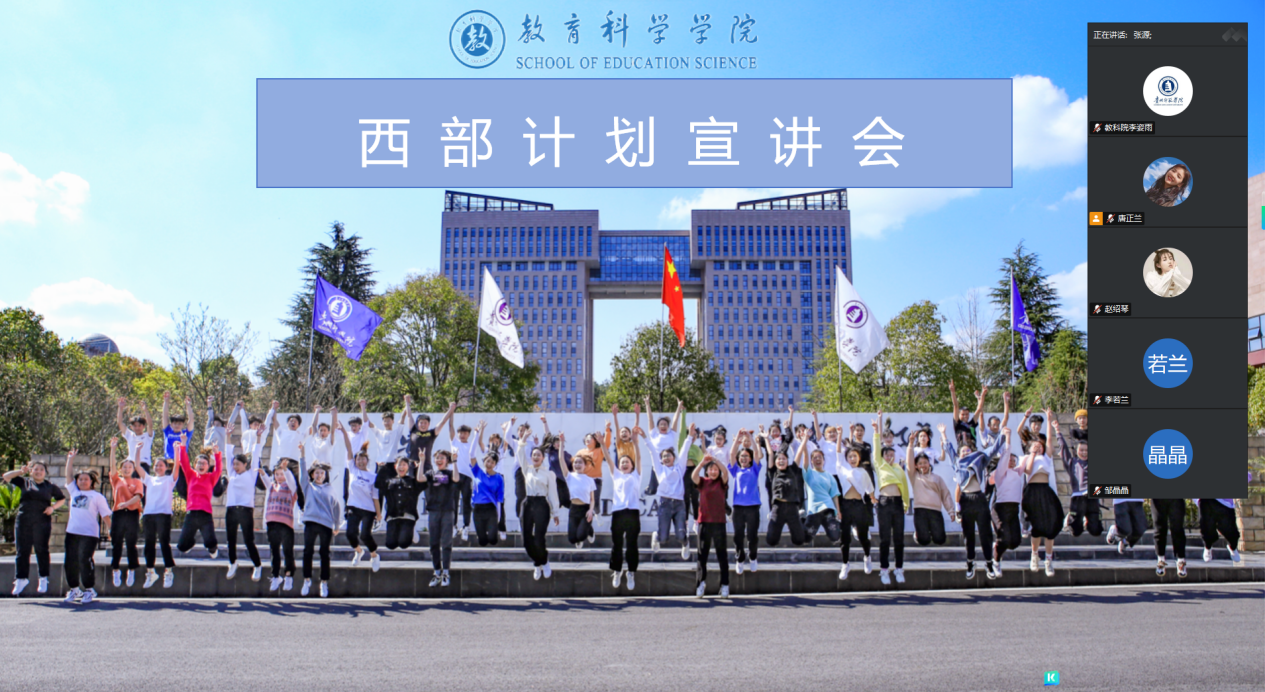 2025年3月5日,贵州千亿qy88国际官网入口通过线上平台成功举办了西部计划宣讲会。本次会议旨在向广大教科院学生深入宣传西部计划的重要意义,激发同学们的参与热情,为投身西部建设贡献青春力量。此次会议由学院团委书记张源老师担任主讲嘉宾,团委负责人李姿雨老师担任主持人。