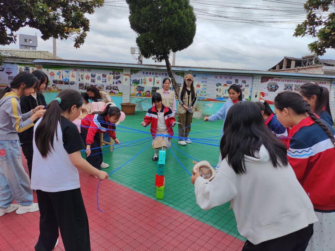 最具挑战性与趣味性的当属“合力建塔”。同学们被分成若干小组,每组10人。各小组领到建塔道具后,迅速投入“战斗”。大家牵拉着绳子,操控钩子吊起积木,小心翼翼地堆叠搭建。过程中,有人指挥协调,有人专注操作,团队协作氛围浓厚。虽偶有积木掉落,但大家毫不气馁,重新再来。