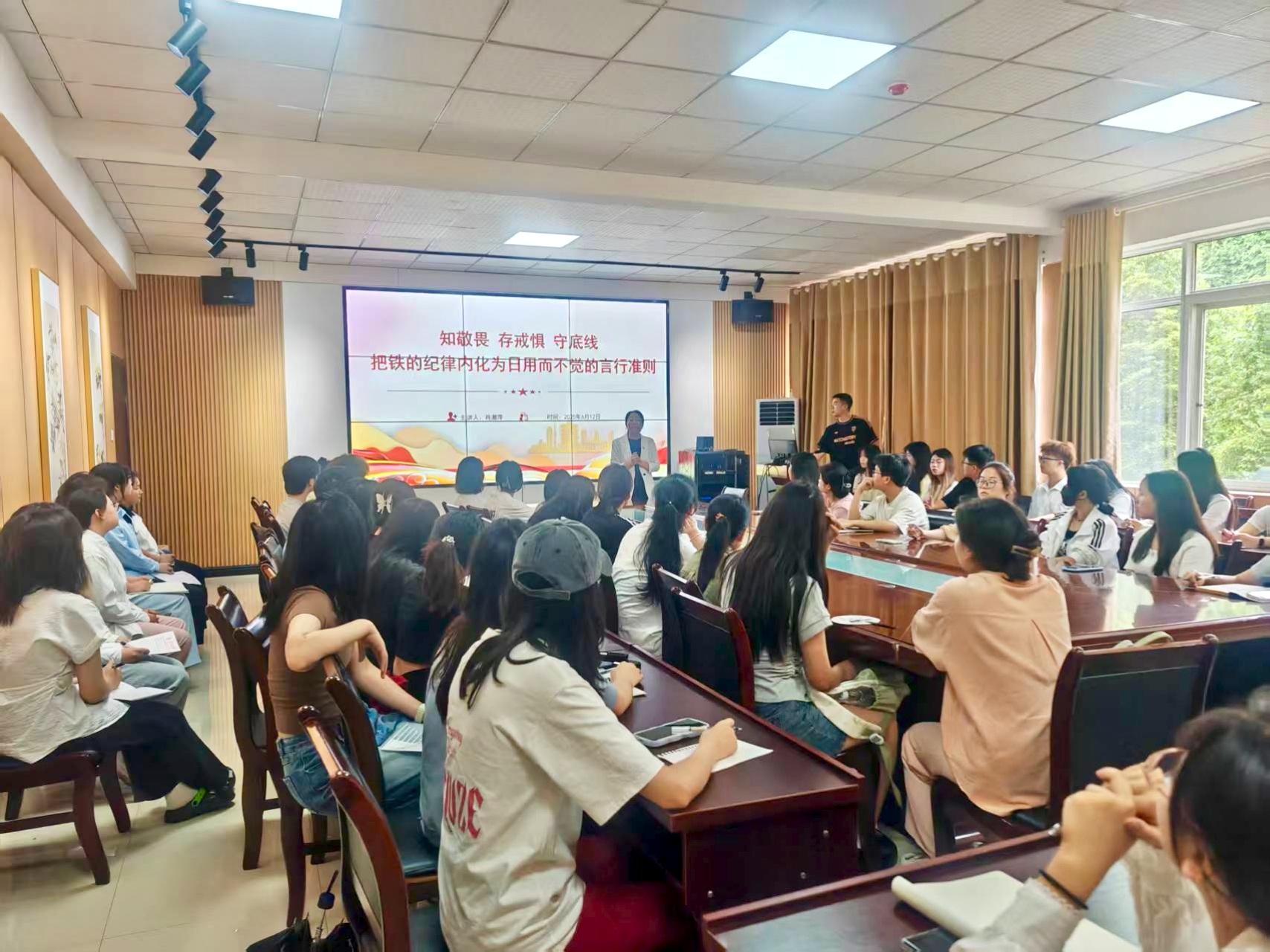 为推动深入贯彻中央八项规定精神学习教育走深走实,进一步加强学生党员纪律教育,强化党员身份意识,加强党支部作风建设。6月12日,教育科学学院在逸夫楼321学院会议室组织开展了“知敬畏存戒惧守底线——把铁的纪律内化为日用而不觉的言行准则”的专题党课。此次党课由学院党委书记肖湘萍主讲,全体党员学生参与。