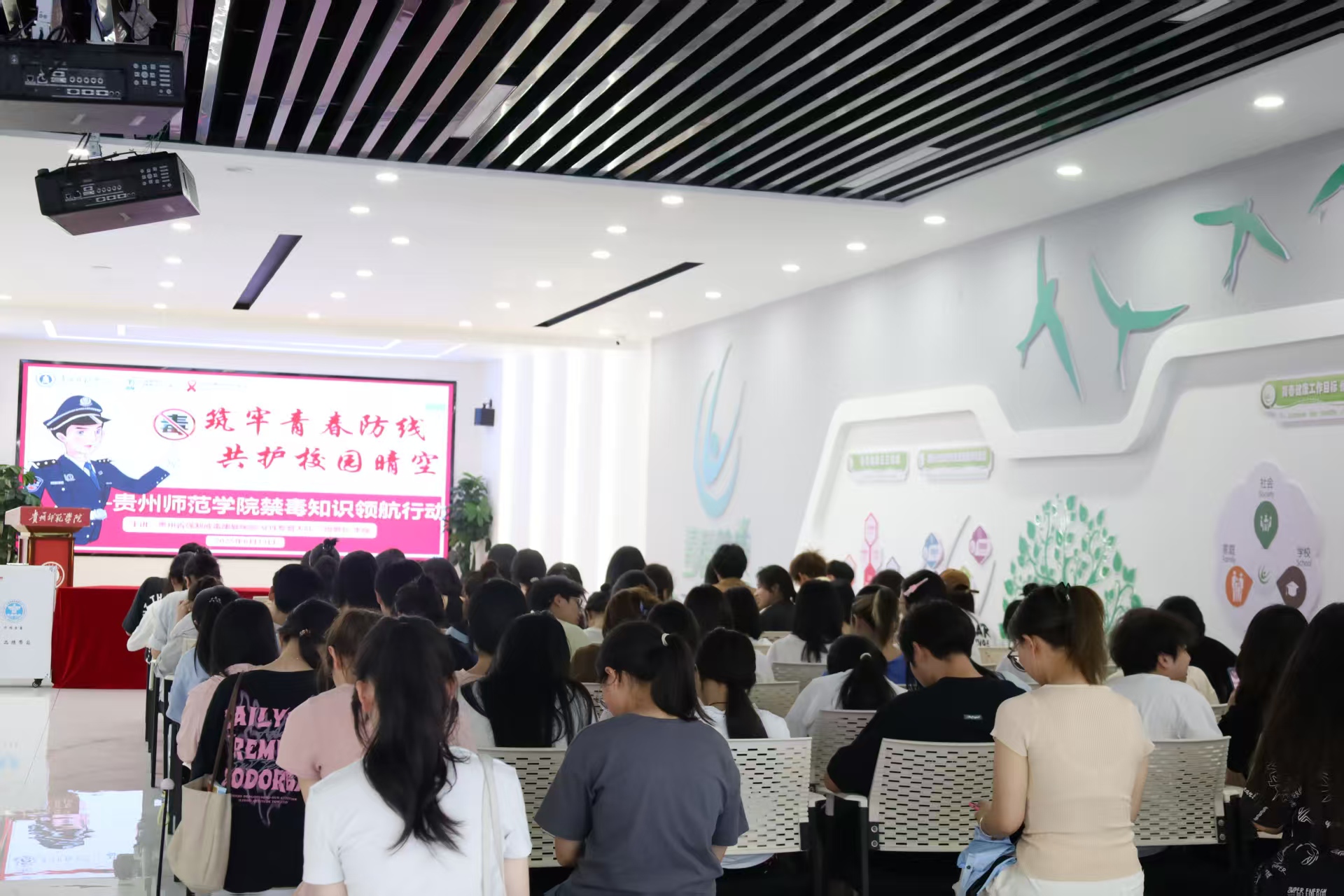 为进一步加强校园禁毒宣传工作,提高学生识毒、防毒、拒毒意识,6月13日,由贵州师范学院荏苒时光辅导员工作室、红丝带防艾协会联合主办的“筑牢青春防线,共护校园晴空——高校禁毒知识宣讲领航行动”主题讲座在我校大学生事务中心顺利开展。本次讲座特邀贵州省强制戒毒康复医院女性专管大队三级警长李璇担任主讲人,为同学们带来了一场别开生面且极具教育意义的禁毒知识讲座。贵州省强制戒毒康复医院女性专管大队副队长廖芩、贵州师范学院学工部副部长官鹏飞、教育科学学院党委副书记傅小芳出席,活动由荏苒时光辅导员工作室主持人、教育科学学院辅导员申苒主持。