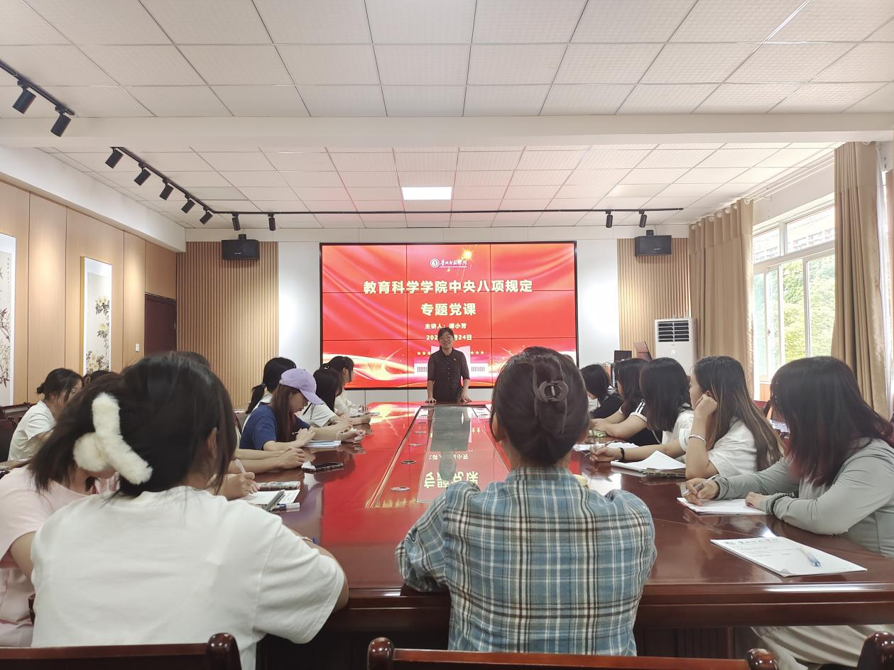 为深入学习贯彻中央八项规定精神,进一步加强党员的纪律意识和作风建设,教育科学学院于6月下旬开展了一系列专题学习活动。学院领导班子分别为学生党支部和教师党支部带来精彩的专题党课,在全体党员中引发热烈反响。
