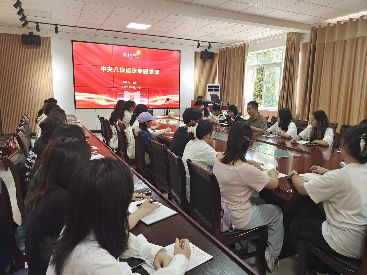 6月25日,院长宋万琚以“深入学习贯彻中央八项规定精神 持续推动学院高质量发展”为主题,为学生党支部带来了一场深刻的讲座。他强调,中央八项规定精神是学院高质量发展的重要保障,全体党员要将其融入到日常学习和工作中。他结合学院的实际情况,提出了在教学科研、学生管理、师资队伍建设等方面贯彻落实中央八项规定的具体举措,激励党员们以优良的作风为学院发展贡献力量。