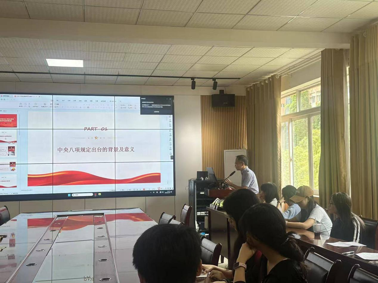 6月30日,副院长黎平辉为学生及教师党支部讲解中央八项规定出台的背景及意义。他从历史和现实的角度出发,全面回顾了中央八项规定出台的时代背景,深刻剖析了其对于加强党的建设、推进国家治理体系和治理能力现代化的重要意义。黎平辉指出,中央八项规定是党在新时代的徙木立信之举,彰显了党中央推进全面从严治党的坚定决心。党员们要深刻领会中央八项规定的精神实质,不断增强贯彻落实的自觉性和坚定性。