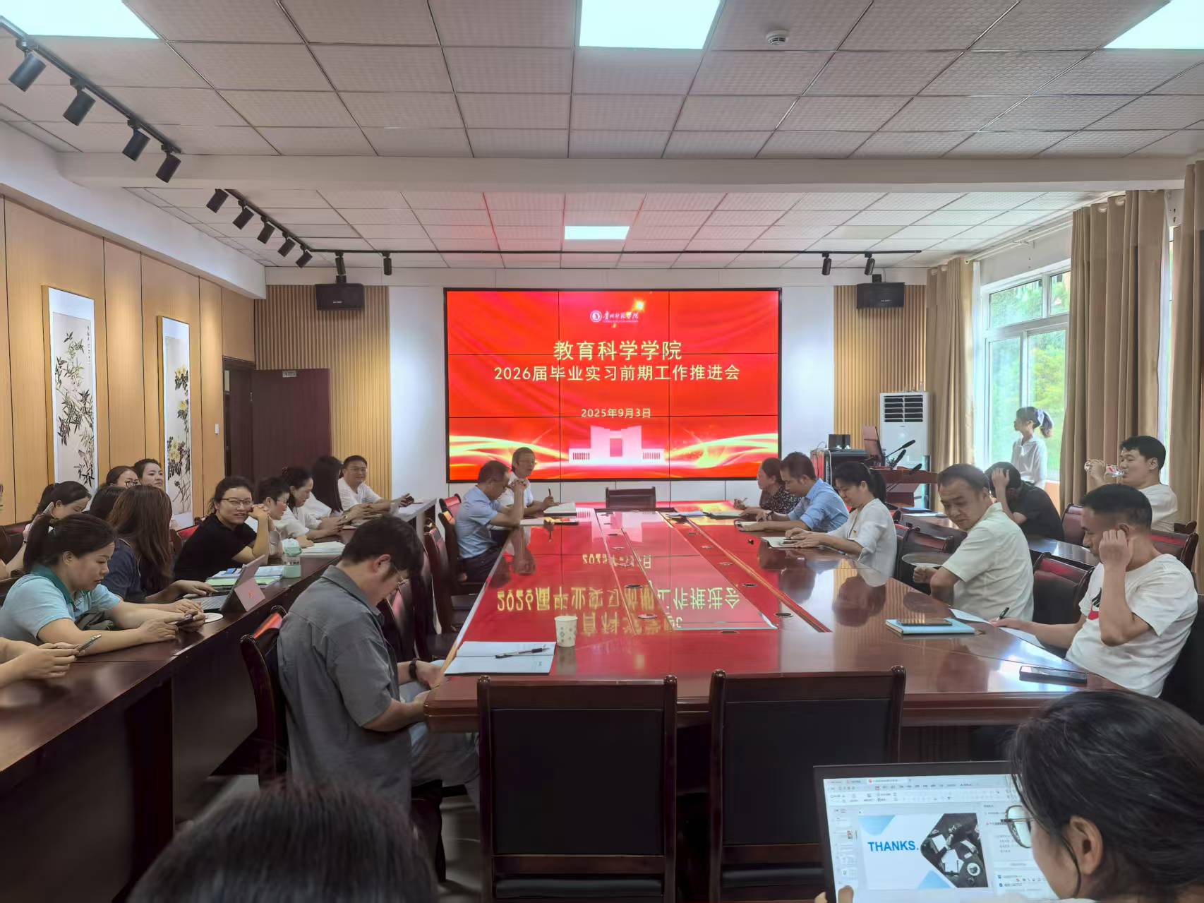 为了明晰实习期间指导教师的工作职责,提升教师实习指导的有效性,进一步保障学生实习效果,2025年9月3日,教育科学学院在逸夫楼321会议室召开了2026届实习工作推进会。党委书记肖湘萍、院长宋万琚、党委副书记傅小芳、副院长黎平辉、副院长袁川以及全体2026届实习指导教师参加了此次会议。