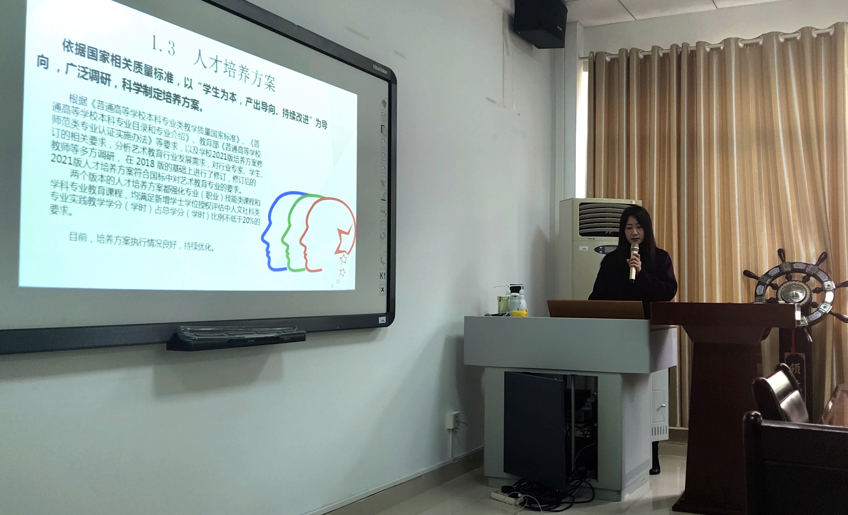 随后,专家组听取了艺术教育专业负责人马慧慧副教授从专业建设及人才培养、师资队伍、教学资源及利用、培养过程及管理和学生发展五个方面对专业自评情况的汇报。本着“替学校把关,为学院服务”的原则,根据省教育厅的评价指标认真查阅了专业自评报告、发展规划、培养方案以及相关的支撑材料,并从培养目标设置、课程体系构建、教育教学改革、办学特色培育、支撑材料完善等方面提出了针对性的意见和建议。质评办主任任翠娟全程参与本次评估,并通过评估向学院宣讲了教育部、省教育厅在专业建设管理上的新要求,同时,就学校下一步如何加强对新专业建设质量的监控做了介绍。