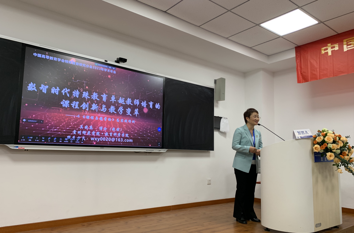 2023年11月4日下午,会议分五个分论坛如期展开,主题分别是特殊教育专业建设、融合教育发展、特殊教育课程与教学、特殊儿童教育康复、特殊教育师资队伍建设,并以海报发表、电子论文集的形式,丰富展现特殊教育研究者在推进特殊教育高质量发展过程中取得的理论和实践方面的丰硕成果。我校教育科学学院教授吴晓英博士以《数智时代卓越特殊教育师资培育的课程创新与教学变革——以《课程与教学论》为实践样例》被推选在“特殊教育师资队伍建设”第五分论坛做报告。