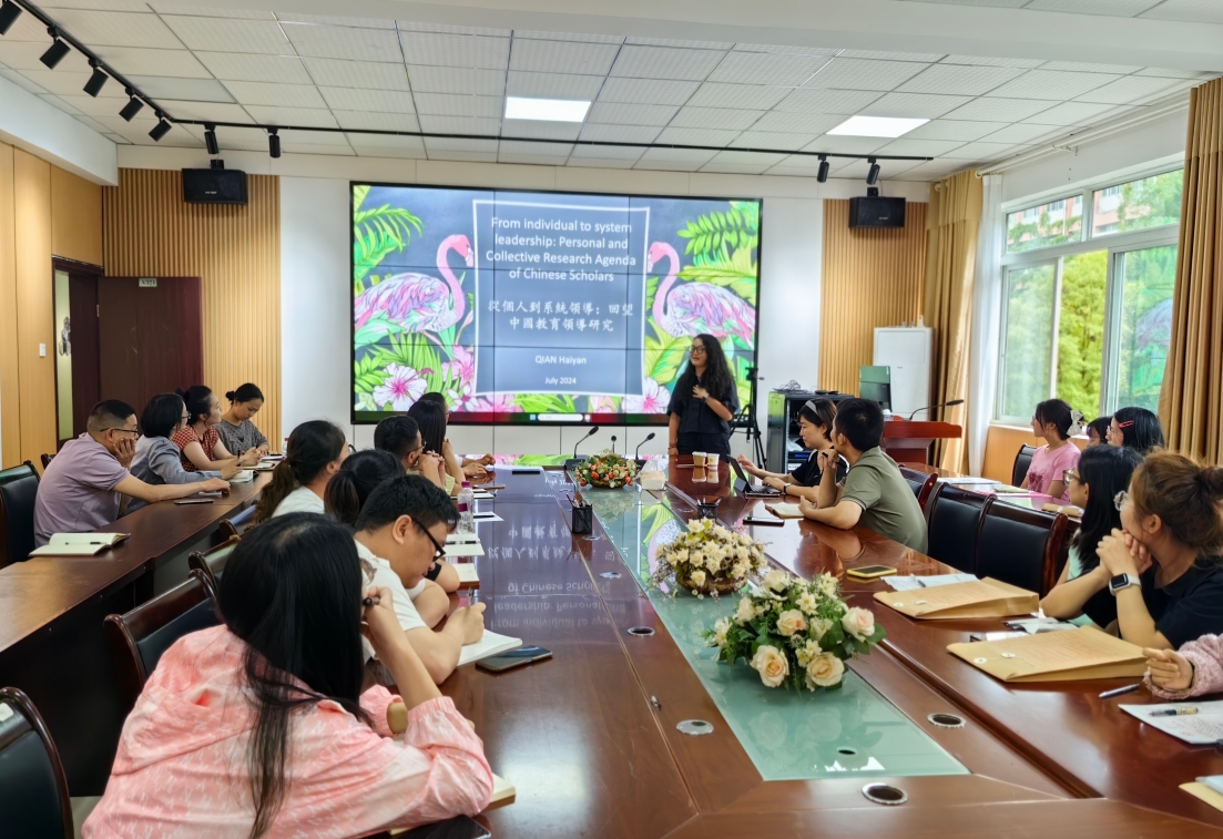 2024年7月1日,恰逢香港回归24周年,香港教育大学钱海燕教授到教育科学学院开展《从个人到系统领导:回望中国教育领导研究》的学术报告。学术报告会由教育科学学院院长宋万琚主持,教育科学学院教师、我校与师大联合培养的教育管理研究生、一线校长及部分本科生参加了本次学术报告。