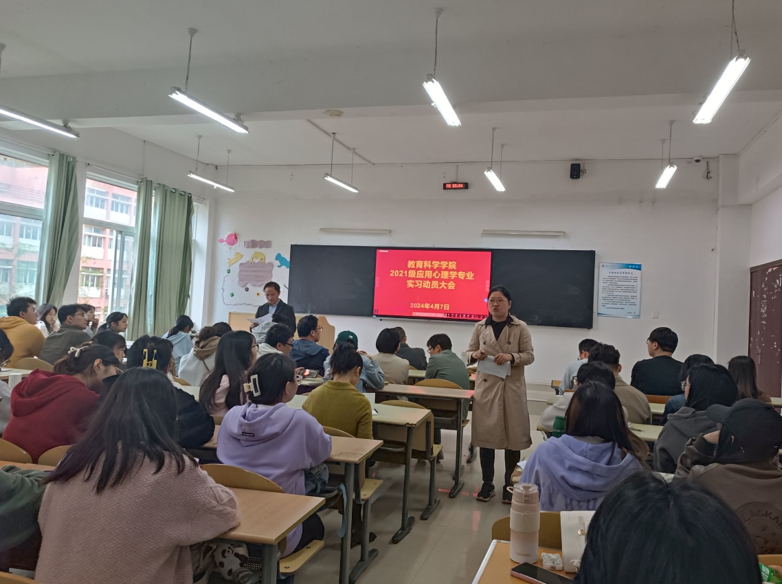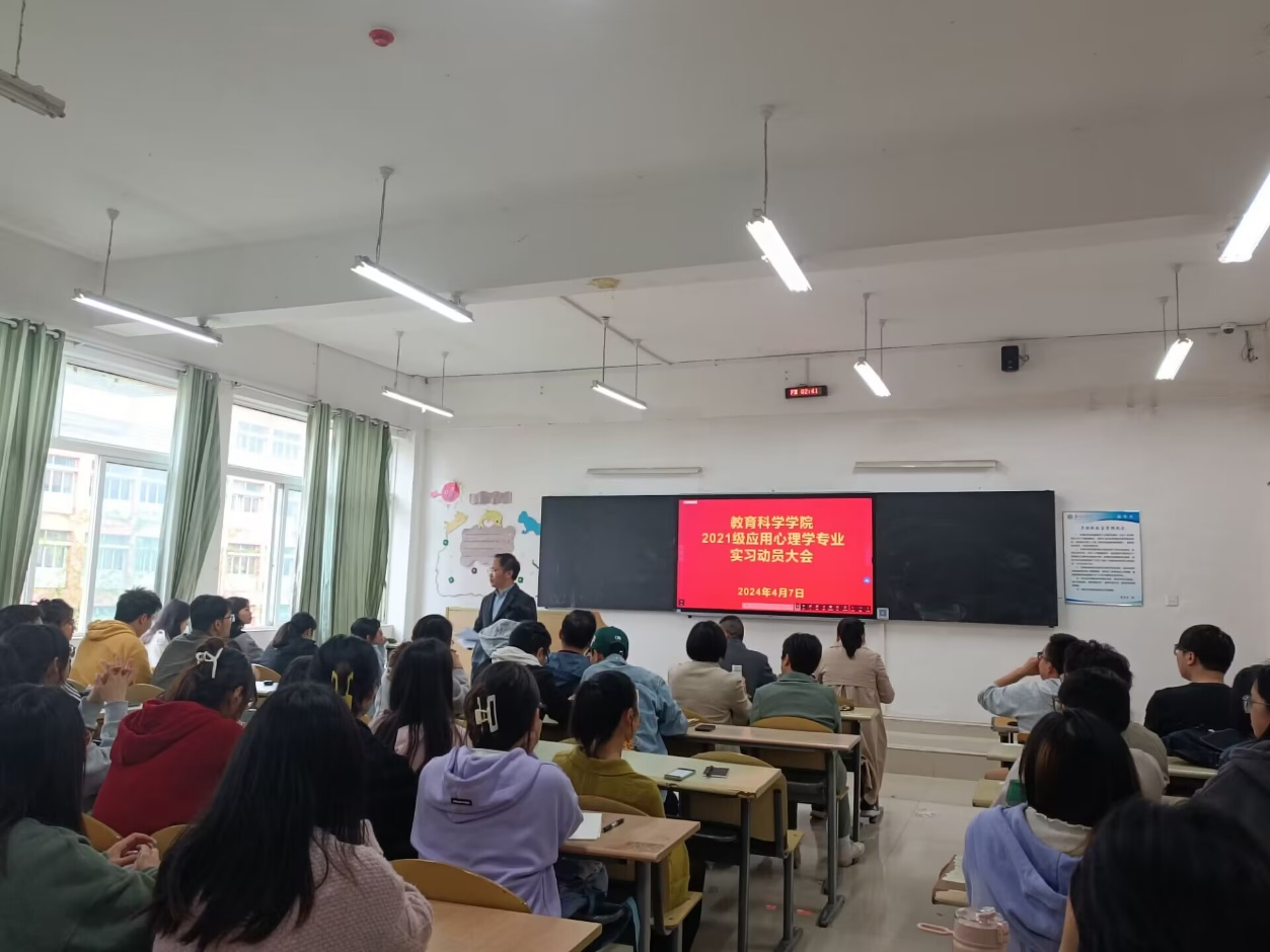 为了让实习生更好的了解和胜任实习工作,4月7日下午,教育科学学院在逸夫楼501教室举办了应用心理学专业2024届实习总结暨2025届实习动员大会。教育科学学院院长宋万琚、副院长黎平辉、副书记傅小芳、辅导员张思远以及应用心理学系全体教师出席,黎平辉主持此次大会。