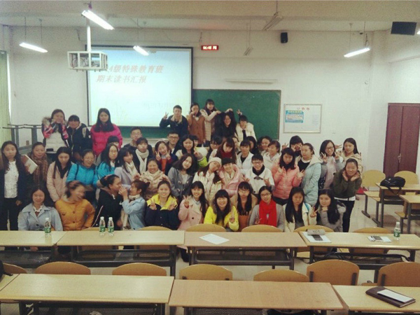 2015年12月10日14点10分,14级特殊教育班于逸夫楼505展开2015-2016年第一学期期末读书交流会,教育科学学院刘婧老师、杨娟老师、田婧老师及全体14级特教班学生参加了本次活动。