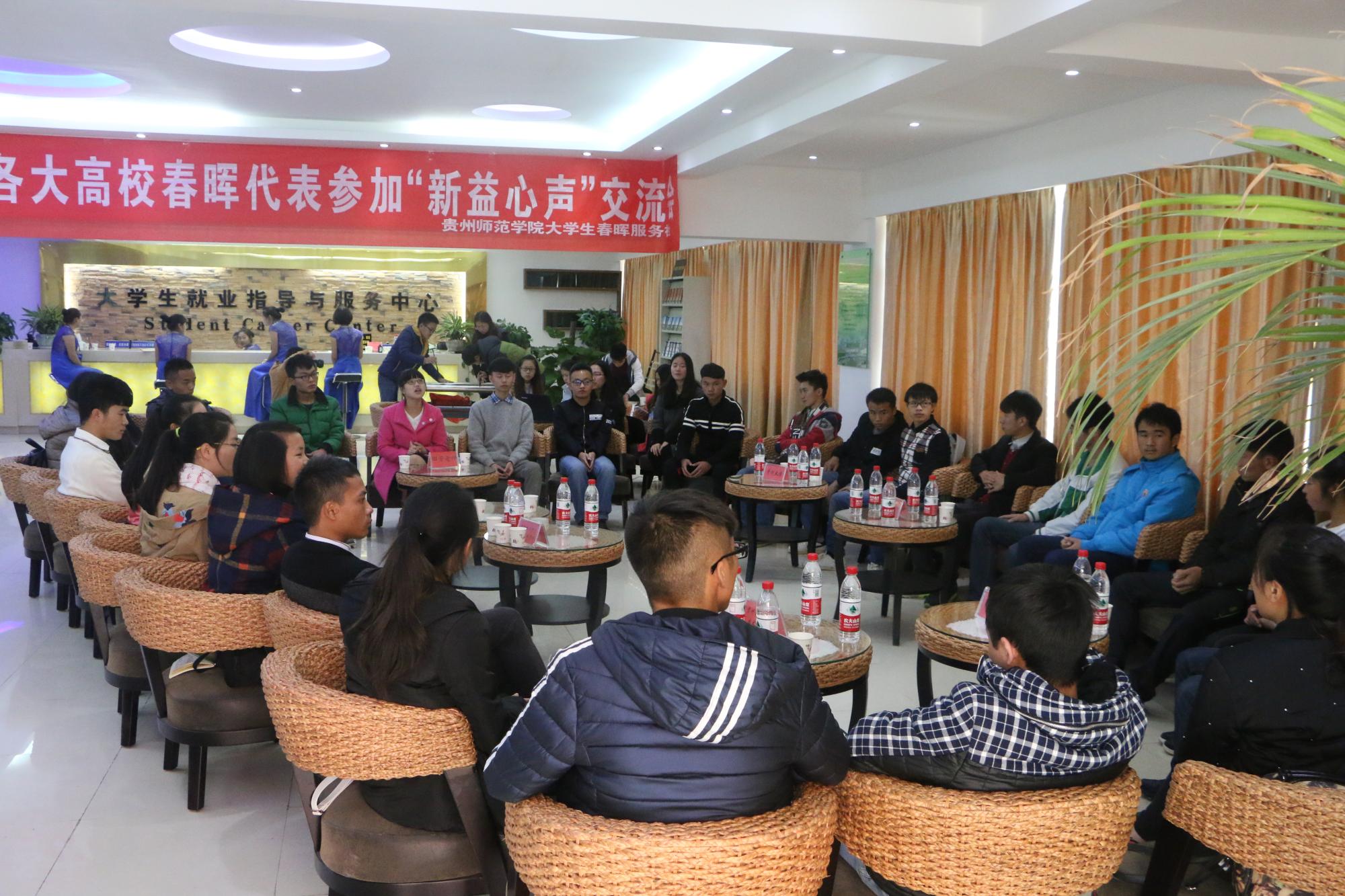 2015年12月6日14:00,教育科学学院大学生春晖服务社联合贵阳各高校春晖代表及全国高校春晖联盟指导老师田芳、王博共同组织开展“新益心声”交流会。活动的主旨在于加强贵阳市各高校之间的交流、对话与合作,解决目前我省高校春晖发展中的基本问题,分享经验,对未来发展建设做规划蓝图。