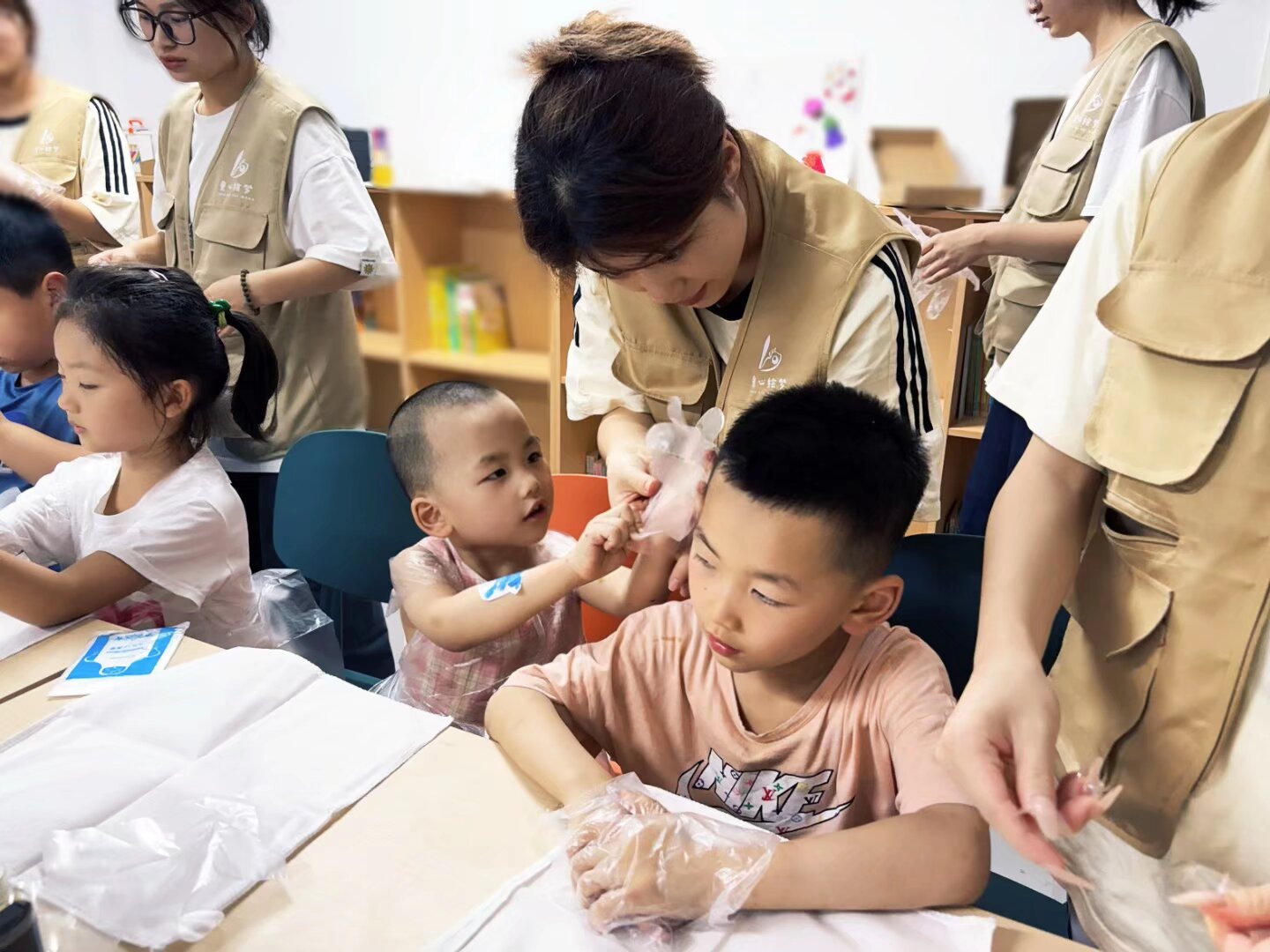 活动伊始,志愿者们为孩子们讲解了扎染的历史渊源和制作原理,通过生动的语言和图片展示,让孩子们对这一传统工艺有了初步认识。随后,志愿者们为孩子们分发了精心准备好的扎染所需的布料、染料、皮筋等工具,并一步步示范扎结、浸染等关键步骤。孩子们在志愿者的耐心指导下,充分发挥想象力,将白布通过折叠、捆绑等方式制作出独特的图案,再浸入靛蓝染料中。过程中,孩子们热情高涨,不断提出创意想法,现场气氛活跃。志愿者们则全程陪伴,确保操作安全,并鼓励孩子们大胆尝试。最后,孩子们将染好的布料展开晾晒,阳光下呈现出深浅不一、花纹各异的作品,每一块布都承载着孩子们的巧思与喜悦。