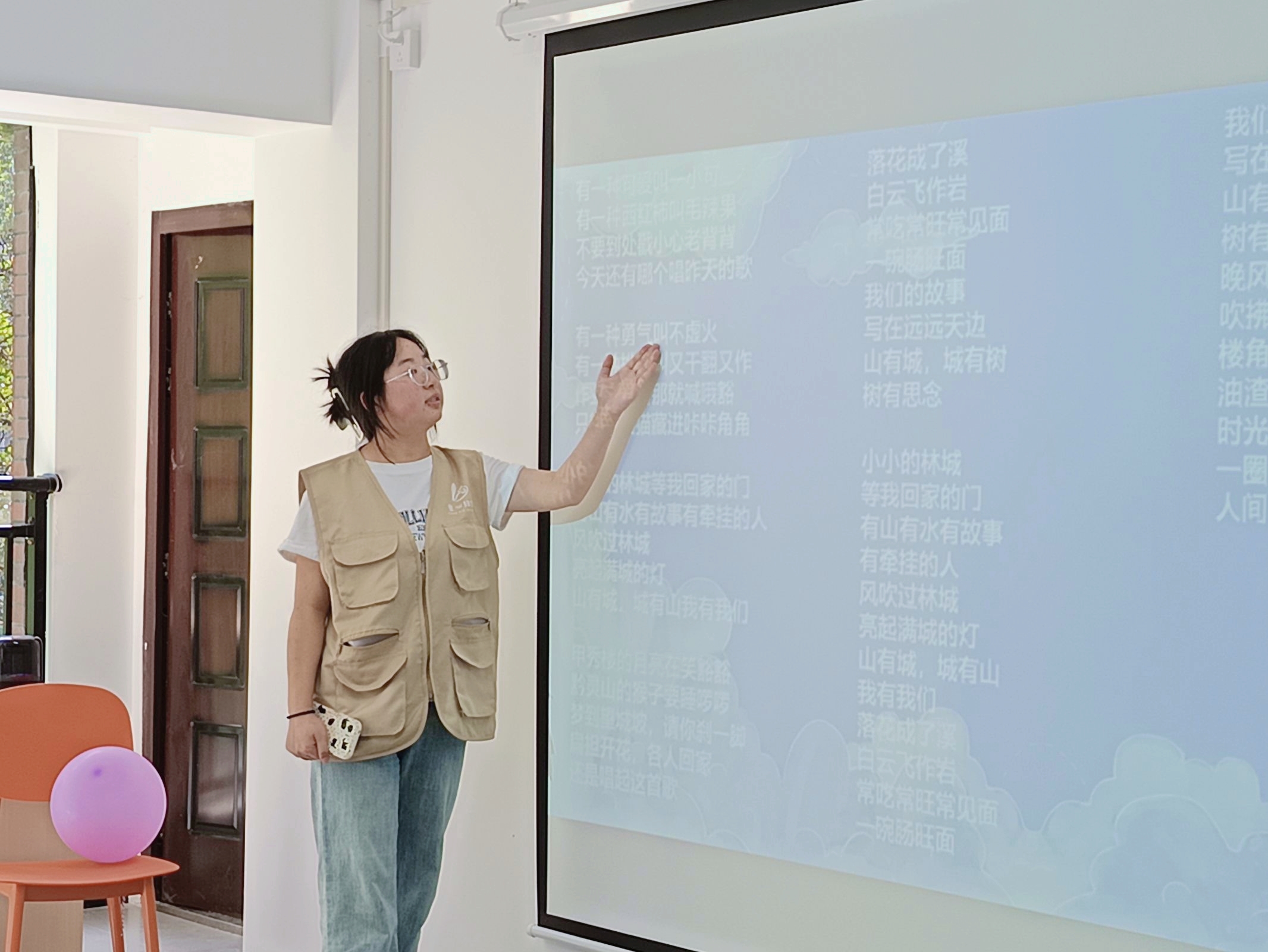 活动伊始,来自贵州千亿qy88国际官网入口的音乐舞蹈组的志愿者们共同带领孩子们开启了一段妙趣横生的音乐之旅。《林城谣》的歌词中融入“毛辣果”“不虚火”等本土方言词汇,让孩子们在学唱过程中加深对贵阳本土方言的认知。活动现场,志愿者们采用科学系统的教学方法,通过“听、说、读、唱”四个环节展开教学。首先播放原版童谣让儿童熟悉旋律,随后逐句讲解歌词中“毛辣果”“咔咔角角”等方言词汇的含义。在教学过程中,志愿者们创新运用手势辅助、情景模拟等方式,帮助孩子们掌握方言发音特点。在志愿者的指导下,许多孩子对歌词中出现的方言表现出浓厚的兴趣,孩子们的学习热情高涨,他们全神贯注地跟唱,清脆的童声弥漫了整个教室。