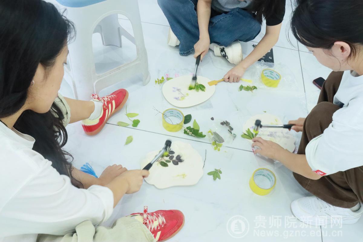 活动现场准备了素面团扇、新鲜植物叶片及拓印工具。在负责人的简要讲解后,同学们精心挑选叶片,在扇面上构思布局,随后用胶带固定,手持小锤轻轻敲击。伴随着有节奏的敲打声,植物的脉络纹理渐渐清晰浮现,青绿的汁液渗透扇面,晕染出自然灵动的图案。活动现场锤声此起彼伏,欢声笑语不断,一片片普通的树叶在同学们手中化作独具韵味的艺术创作。许多同学表示,这是第一次亲身体验植物拓印,在锤击过程中不仅感受到了传统技艺的魅力,更体会到了“慢工出细活”的匠心精神。活动现场还设置了作品展示区,一幅幅各具特色的植物拓印扇面陈列其中,宛如一场小型艺术展览。